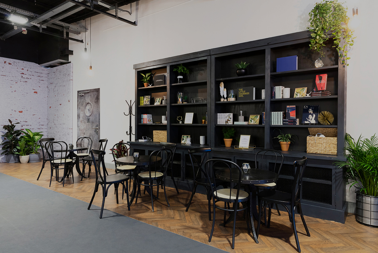 Pour créer un esprit loft bistro avec touches industrielles, nous avons utilisé un sol effet parquet, des cloisons en brique vieillie et un vinyle aspect métal galvanisé sur les portes existantes. Par ailleurs, un bar bistro sur mesure avec un arrière-bar et un mur végétal a adouci l’ambiance industrielle. De plus, l’éclairage à filament suspendu et le mobilier — canapés Chesterfield, fauteuils, tables et chaises de bistrot — ainsi qu’une grande bibliothèque d’exposition, ont renforcé le thème.